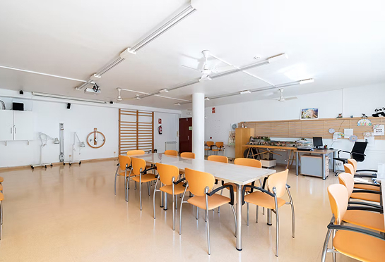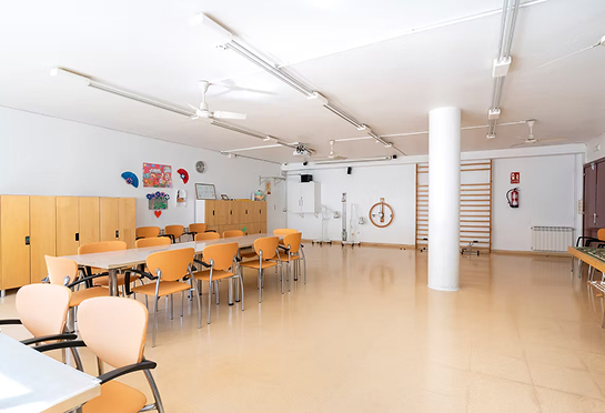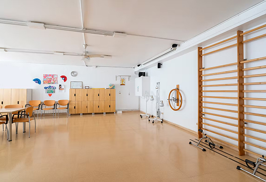 Espacio equipado con aparatos específicos para fisioterapia y rehabilitación, donde los residentes trabajan movilidad, equilibrio y fuerza bajo supervisión profesional. La sala también acoge talleres y terapias grupales.